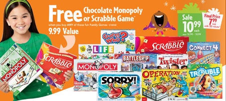 I purchased Life got the Scrabble chocolate game for free and purchased a few other toys. I got the $20 gift card ($10 for spending $75 and $10 for purchasing 2 Hasbro games). Yiphee! Thanks Collins