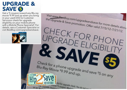 Bring in your original DVD (no burned copies accepted) with the original case to Customer Service and receive a $5-off coupon valid on any Blu-ray movie priced at $9.99 and up. See a Customer Specialist or visit BestBuy.com/upgradeandsave for more details about the Upgrade & Save promotion. Limit 5 coupons per trip. A recycling receipt must accompany the coupon at time of redemption. Once you have received your coupon, if you do not find a Blu-Ray, you are unable to get your turned-in DVD back. Not valid with any other discount or package. Markdown taken from original price or promotional price. Your original DVD must have been commercially packed and with the original case. Adult content DVD’s not accepted. Not valid with any other offer. Valid on in-stock Blu-Ray movies only. Offer valid 7/15/12-8/11/12.