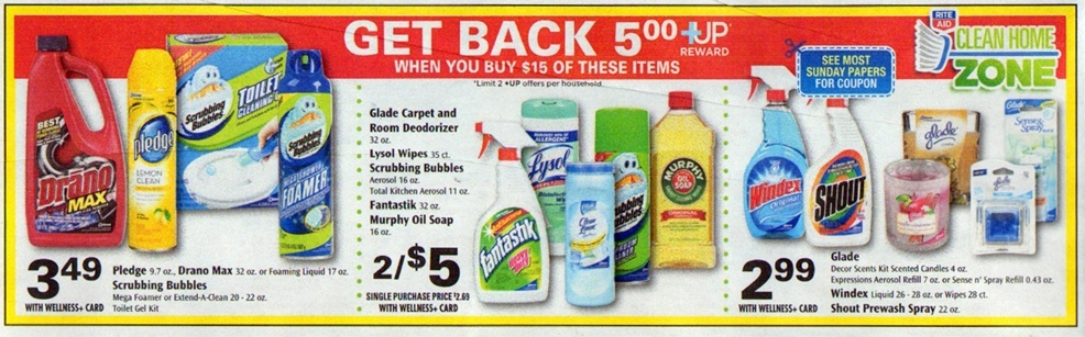 Select Pledge, Drano Max or Scrubbing Bubbles $3.49; Glade Carpet and Room Deodorizer, Lysol Wipes 35 ct., select Scrubbing Bubbles, Fantastik, or Murphy Oil Soap 2/$5; Glade, Windex or Shout Prewash Spray $2.99