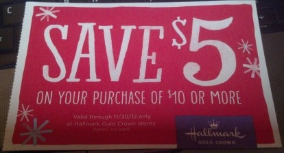 Yay! Here’s a great coupon to use towards a Christmas gift, stocking stuffer or to score inexpensive wrapping paper, greeting cards and more! Just head on over to the Hallmark Gold Crown site and scroll down to print a coupon valid for $5 off any $10+ purchase (good only at your Hallmark Gold Crown store)! Keep in mind that the coupon is valid in-store only and limited to one per customer.