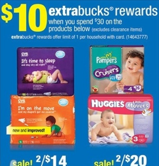Spend $30 on select Pampers, Huggies & CVS brand diapers = $10 Ecb (limit 1)