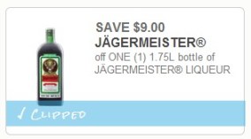 Head on over to Coupons.com where you can score a $9/1 Jagermeister Liqueur 1.75 L bottle coupon – valid through 12/31/13. Keep in mind that this coupon is only valid in, AK, AZ, CA, CO, DC, DE, FL, IA, KS, KY, MI, MT, NV, NM, WI, WY.