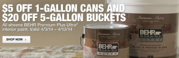You can also score some great deals on paint – Get $5 off 1 Gallon Cans and $20 off 5 Gallon Buckets of BEHR Premium Plus Ultra Interior Paint.