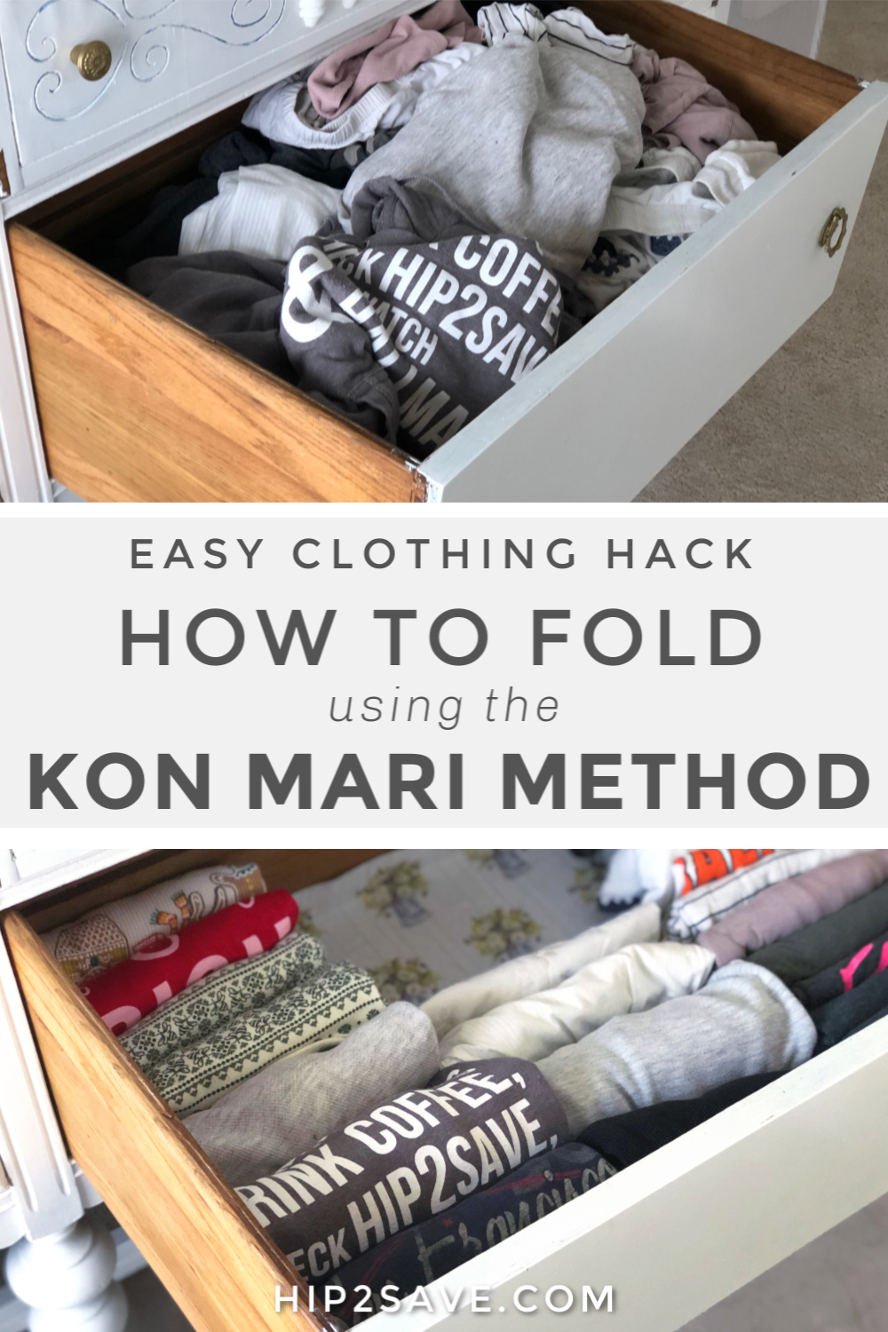 “I started using this method a few years ago and have never looked back. I first de-cluttered my kid’s messy drawers using this method and the difference it makes is truly amazing! Not only does each drawer have more space, but you can visually see all clothing options at one time since every item is facing upright.”