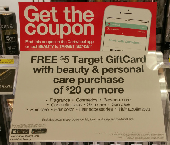 Scan the FREE $5 Target Gift Card with beauty & personal care purchase of $20 or more coupon found in the ad, on the Cartwheel app OR by texting BEAUTY to 827438