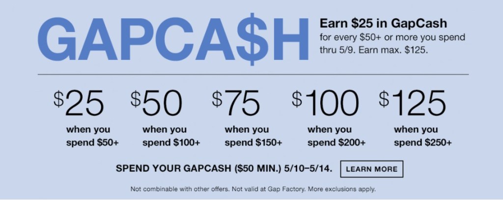 In addition, you can earn $25 in Gap Cash for every $50 you spend before discounts and tax through May 9th up to a maximum of $125. Earned Gap Cash will then be redeemable May 10th through May 14th.