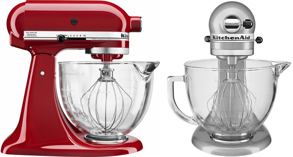 This KitchenAid Mixer includes a dough hook, wire whip, a burnished spiral dough hook and a five quart glass bowl that can hold up to 7 pounds of mashed potatoes or enough dough to make four loaves of bread.
