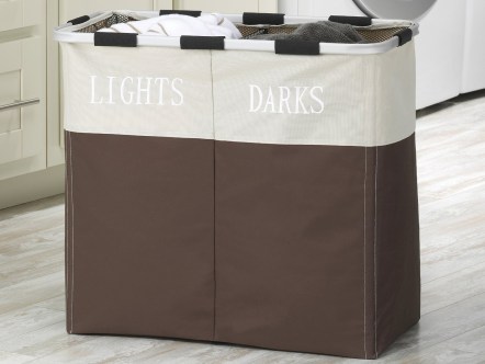 You can also grab this Whitmor 2-Section Laundry Hamper available for only $13.59 from Amazon.com and/or Walmart.com. This hamper is perfect for keeping your dirty laundry concealed and helps to keep lights and darks sorted. The mesh drawstring top keeps clothes in place and the built-in handles make it easy to move from room to room.