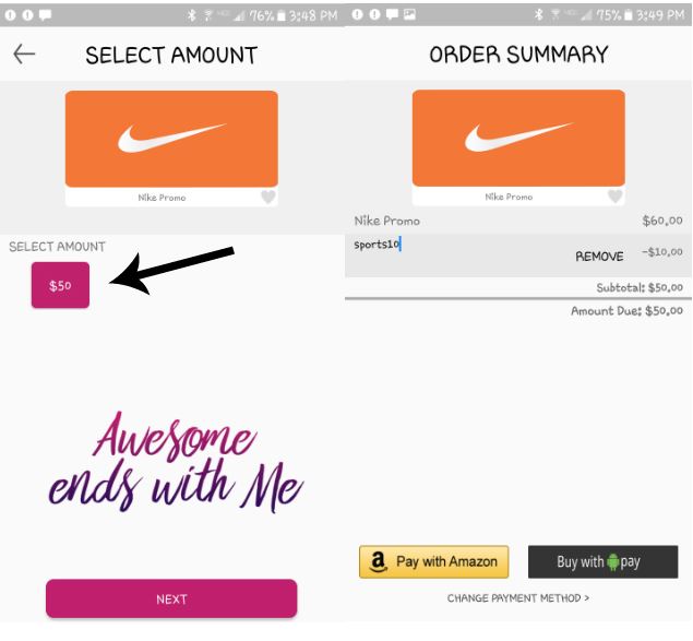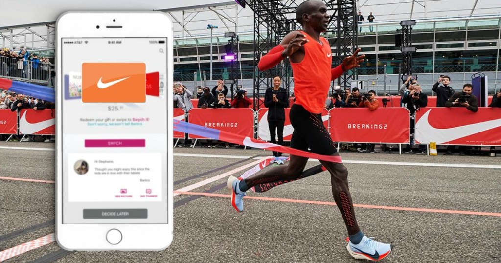 To snag a Nike gift card, open the SWYCH App and enter Nike in the search box. Then click “For a Friend” OR “For Myself” at the top of the app and select who you would like to send the gift card to. Add a $50 Gift Card to your cart, use the code Sports10, and hit Apply – your gift card amount will change to $60 and deduct $10.