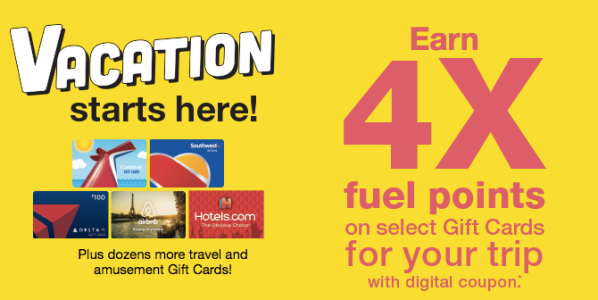 Through July 19th, head here and sign in to your Kroger account to load an eCoupon to your Kroger card valid for 4x FUEL Points when you buy a participating Travel Category gift card. Keep in mind that fuel discounts are limited to up to 35 gallons of fuel per purchase.