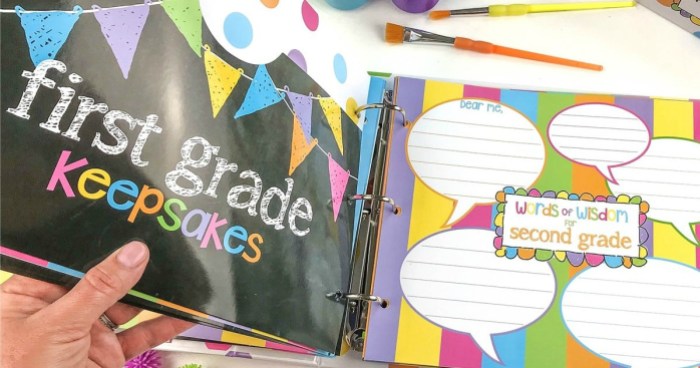 Each section includes a “Words of Wisdom” page with room for notes from several loved ones, First Day/Last Day template pages with side-by-side photo placement to see how much your child changed in a single school year, placeholder for fun facts & favorites, 2 full-size photo pages including one large enough for the 8×10 class photo, pockets for keepsakes and more!
