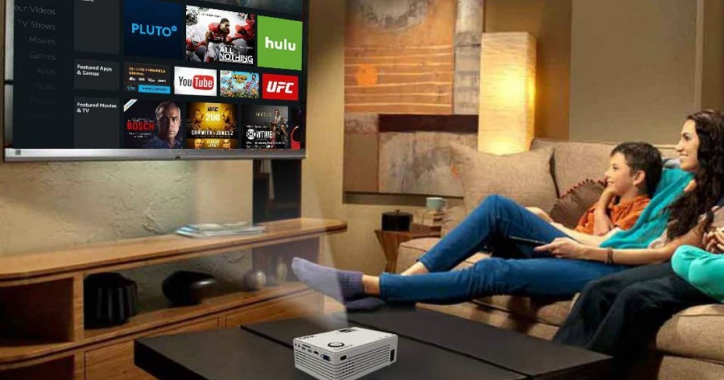 This mini projector supports up to 1080p resolution on up to a 170″ display. It can be connected to your laptop, tablet, DVD player, Amazon Fire Stick and more. Plus, if you have movies stored on a USB drive or SD card, those can be used as well.