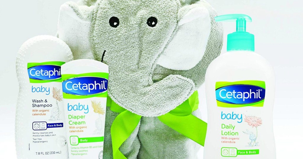 This Cetaphil bath time essentials gift set includes an adorable elephant hooded towel, Cetaphil Baby Wash & Shampoo, Cetaphil Baby Daily Lotion, and Cetaphil Baby Diaper Cream – all made with with Organic Calendula!