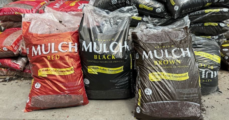 red and brown bags of mulch in garden center of hardware store