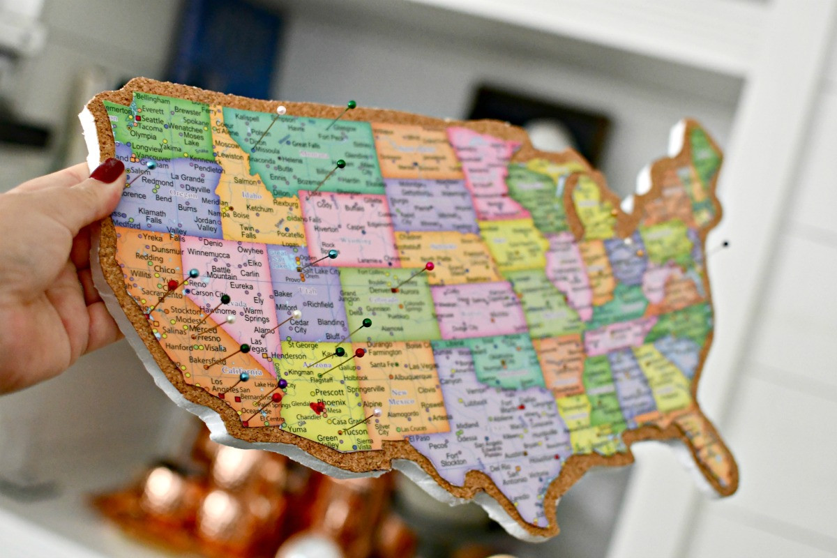 Keep track of where you’ve been by creating a fun corkboard map to display at home. Today I’m sharing how I turned a laminated placemat map and piece of foam cork board into a clever DIY push pin travel map. It’s a unique way to commemorate all your adventures and to serve as a reminder to always keep exploring!