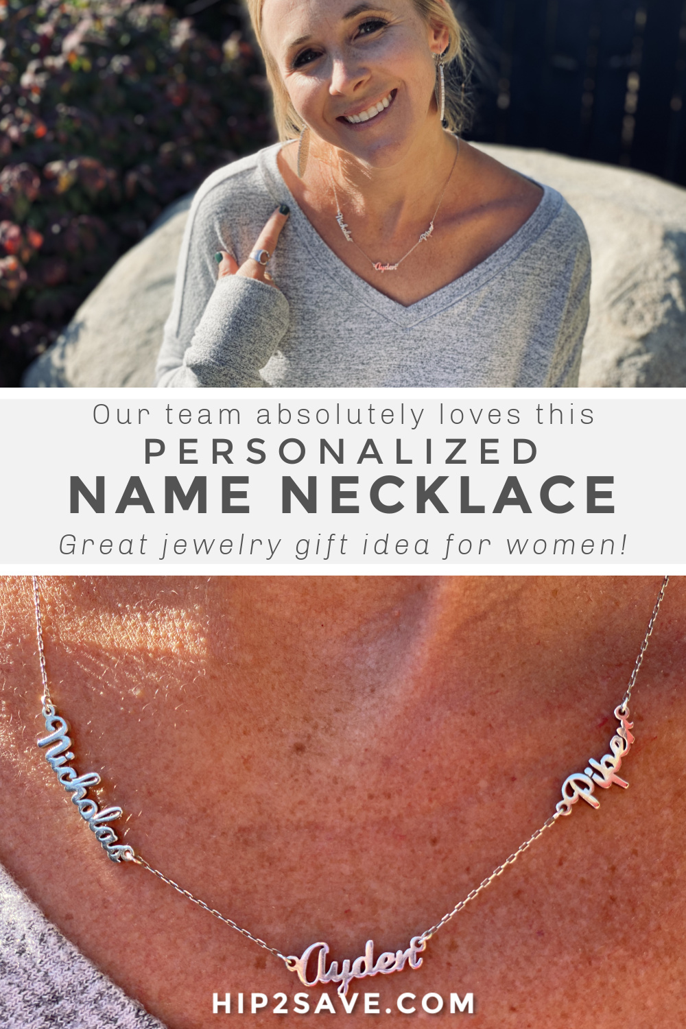 Our team first stumbled upon these name necklaces when Bryn (Collin’s sister) gifted one to Collin and her mom. She shared it with our entire Hip2Save team, and it’s been a hit ever since! 😍 Even after all these years, Bryn, Collin, and their mom still wear their personalized name necklaces every day.