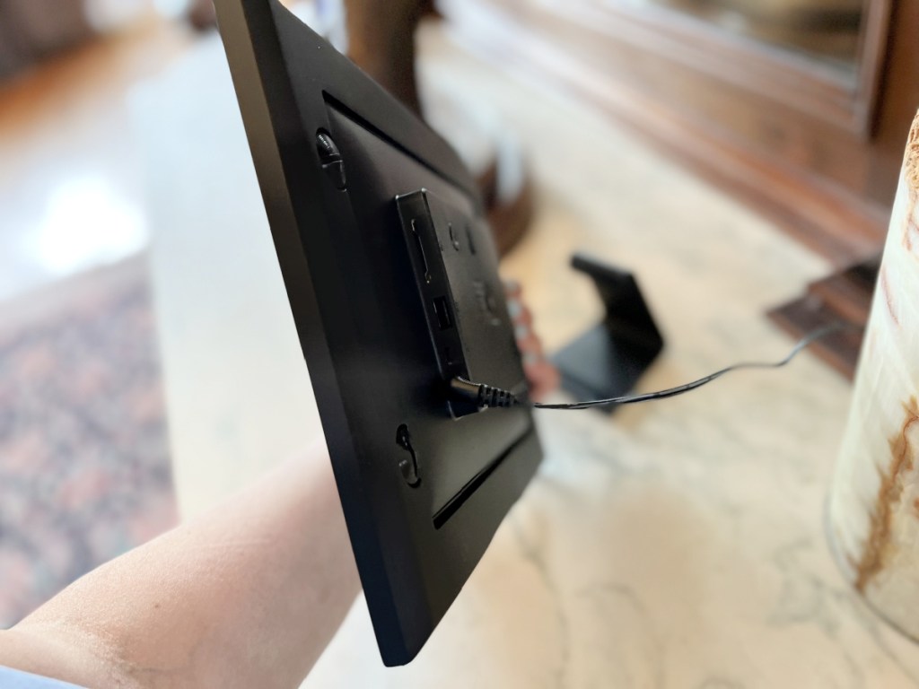 Even sweeter, this frame blends in seamlessly with other decor and it comes with a stand that it sits on for easy displaying. Note this frame needs to connect to WiFi and also needs to be plugged into an outlet to display the photos.