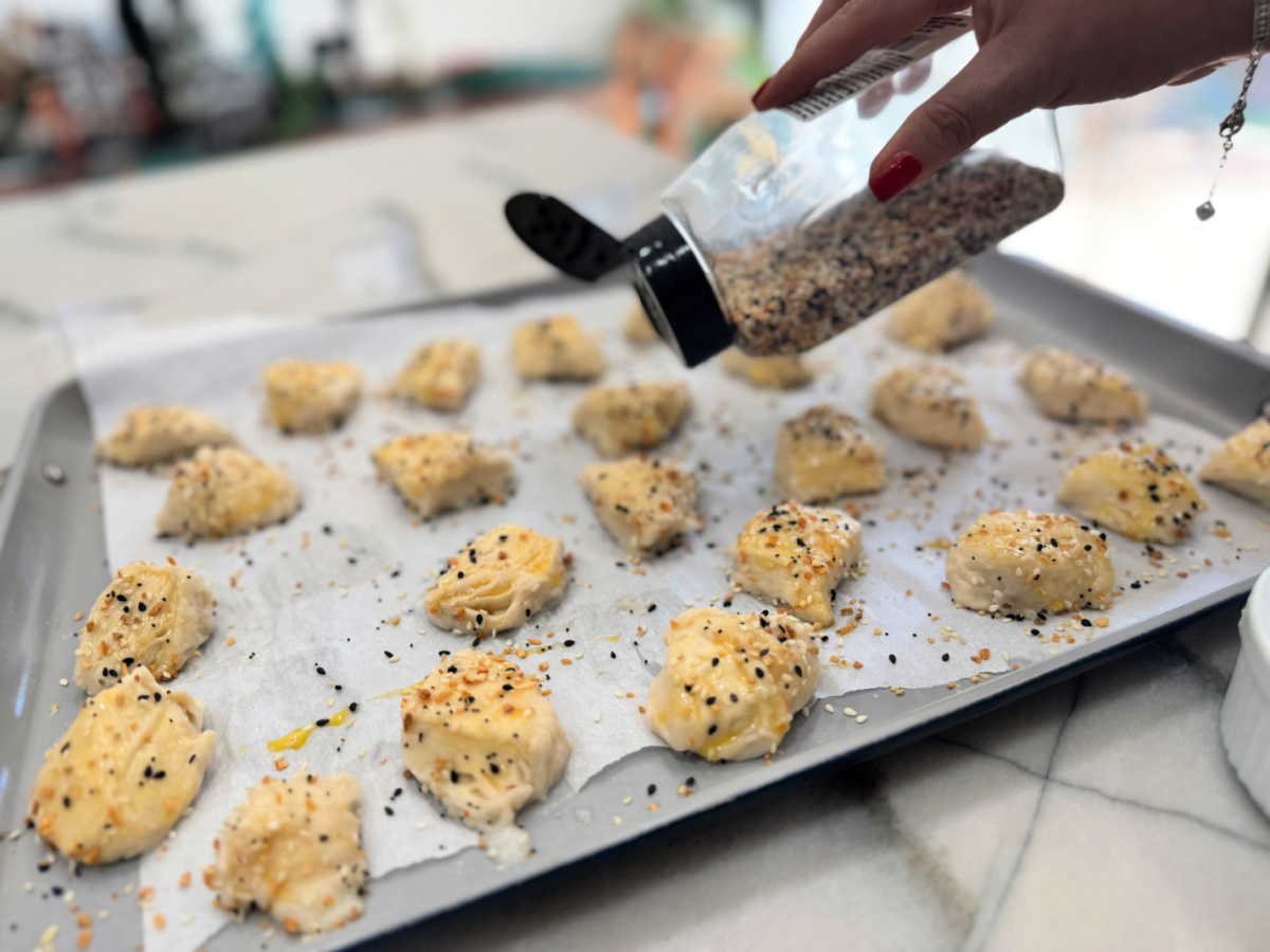 Use a kitchen brush to apply egg wash to the tops of biscuit pieces. Sprinkle with everything bagel seasoning.