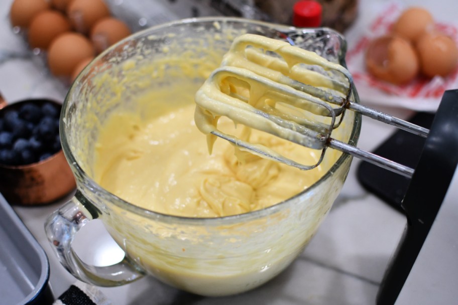 Fold in the fresh blueberries. Pour the cake batter into the pan.