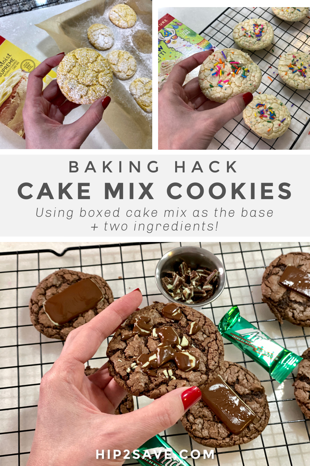 Recently, we tried this hack with a few different boxed cake mixes, and the results were SO good with every single mix we tried! The cookies shown above were made with a box of devil’s food cake mix and melted Andes mints on top. They were AMAZING.