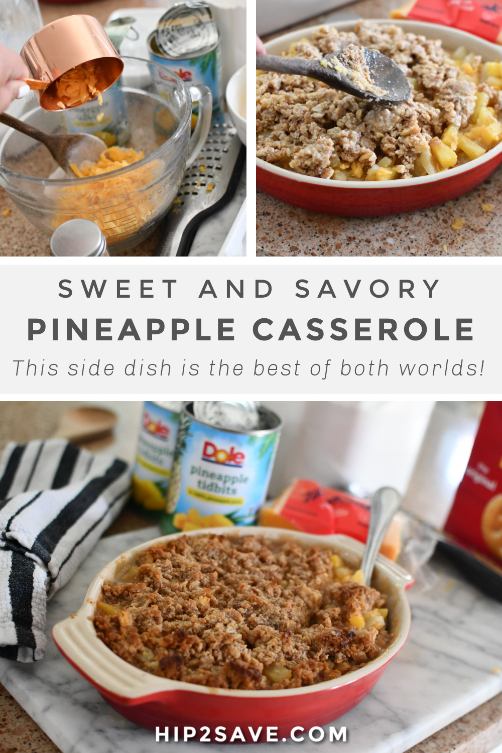 Pineapple casserole, a popular southern-inspired potluck recipe, is made with canned pineapple, shredded cheddar cheese, and has a sweet, buttery crushed Ritz cracker topping. It can be served up alongside ham or pork chops as a sweeter side dish, or by itself as a unique dessert idea.