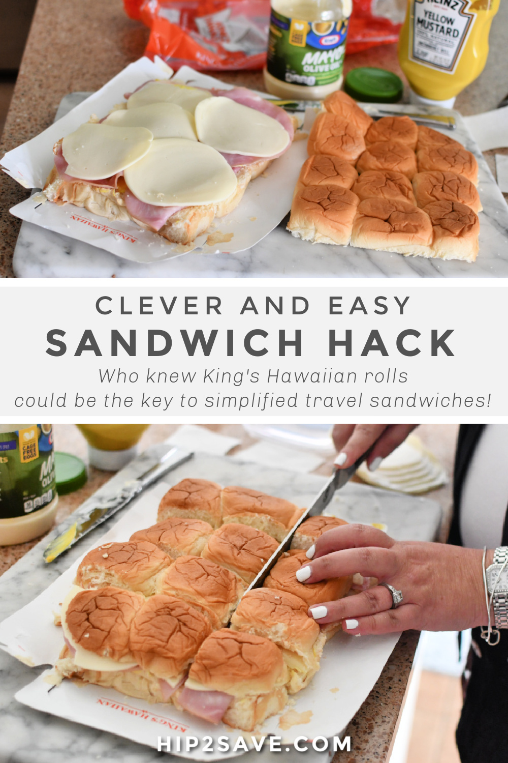 Last year I went on a long road trip and tried this genius prep-ahead sandwich hack that worked so great and was easy to do, so I had to share! This smart tip basically involves compiling one huge sandwich using King’s Hawaiian rolls, adding sandwich fixings, cutting up each sandwich, and then placing them back in the bag.