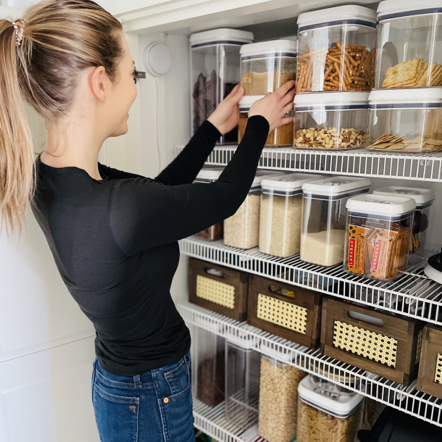 - Pantry – Check food expiration dates using our handy guide. Freeze about-to-expire food, if you’ll use it. Toss or donate what you can’t use. Group remaining items by category (spices, pasta, etc.). Use our favorite pantry organization ideas or the food storage containers Walmart has I used above.