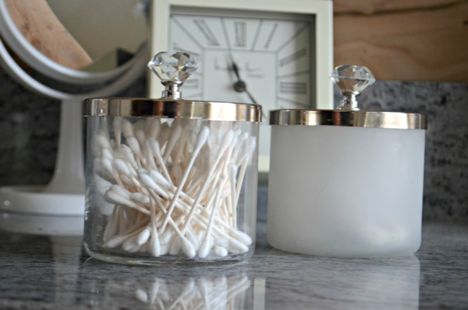 I’m so happy with how they look on the bathroom counter! 😍 I chose to add cotton balls and Q-tips to mine, but you can add any small bathroom necessities that you want. Plus, it doubles as some pretty gorgeous home decor.